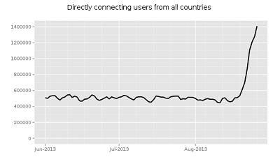 Dalla mailing list di Tor, il responsabile di progetto Roger Dingledine ha annunciato che il totale degli utenti legati alla celebre darknet è più che raddoppiato in poco più di una settimana. Dalle 600mila connessioni nello scorso 19 agosto a 1,2 milioni alla fine del mese , senza alcuna possibilità di errore nell’analisi del traffico sul network della cipolla.