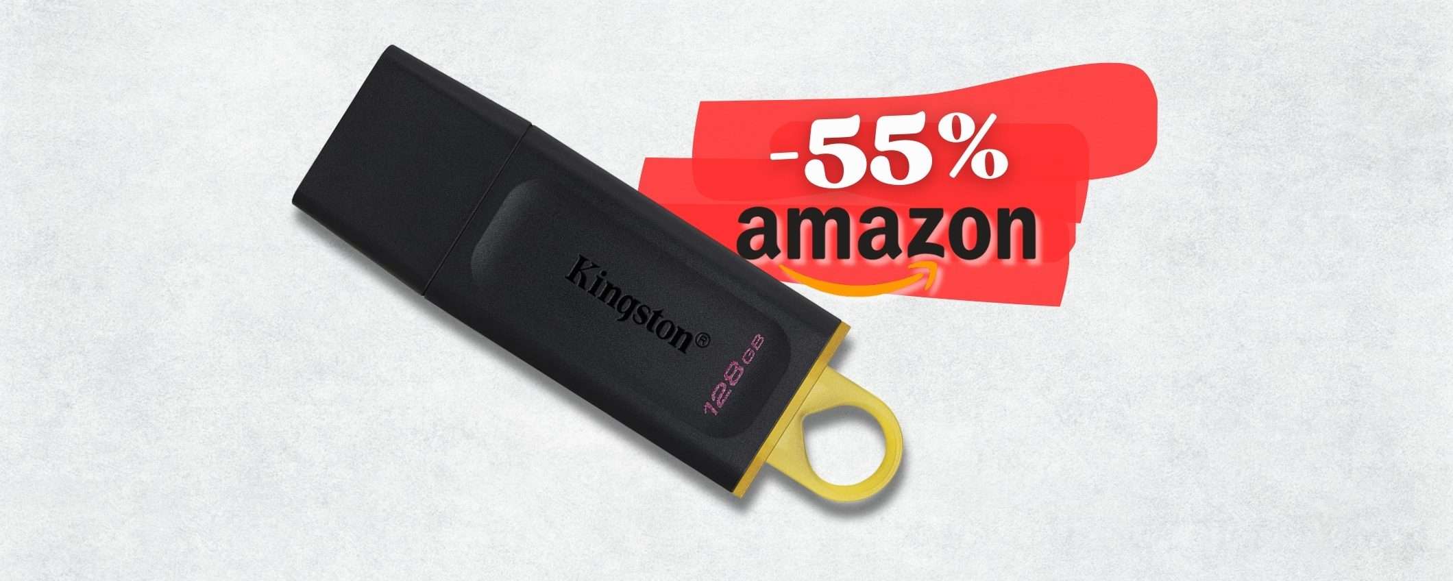 Cosa aspetti?Collegati al volo su Amazon per acquistare con un solo click la tua chiavetta USB di Kingston da 128GB ad appena 8,90€ con sconto del 55%.