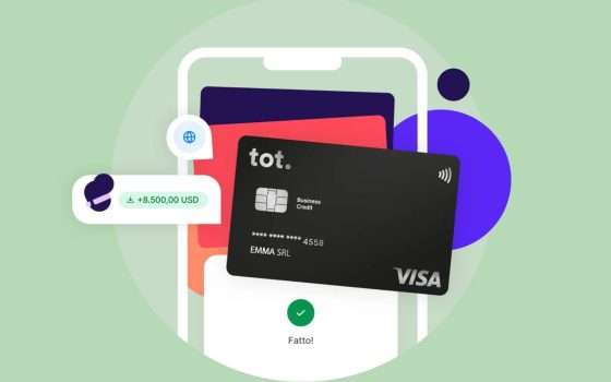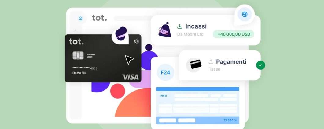 In un solo unico canone, Tot include un conto con IBAN italiano, bonifici SEPA online fino a 250.000 € d’importo, pagamenti SDD per gestire finanziamenti e utenze, pagamenti dei modelli F24 online, collegamenti a Entratel e Fisconline per le deleghe I24, pagamenti pagoPA e una carta di credito Visa Business per tutte le spese aziendali.