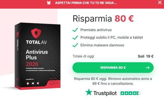 Ogni volta che apri il browser, scarichi un file o ti connetti a una rete Wi-Fi pubblica, stai potenzialmente aprendo una porta a qualcuno che non hai invitato. Virus, ransomware, siti di phishing, spyware nascosti negli allegati email: le minacce sono più sofisticate che mai. Con TotalAV in promozione a soli 19€ con 80€ di risparmio, proteggersi non è mai stato così accessibile.