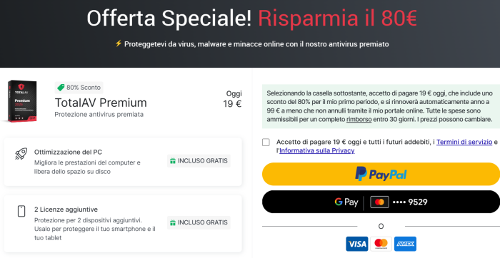 Oggi mettere al sicuro dispositivi e informazioni personali è essenziale, ma con l’attuale promozione diventa anche conveniente. TotalAV Premium è infatti disponibile al prezzo speciale di 19€ per il primo anno, con un risparmio di 80€ rispetto al costo pieno di 99€.