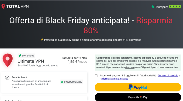 Il tutto, lo ribadiamo, al prezzo scontato di 19€ per il primo anno, l’equivalente di 1,59€ al mese. In più, puoi anche contare su una garanzia di rimborso entro 30 giorni dall’acquisto. Per attivare il piano basta andare sul sito di TotalAV.