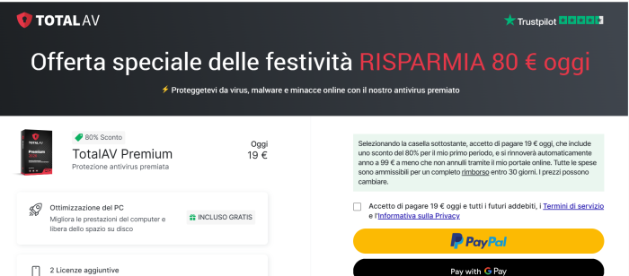 La promozione è valida per i primi 12 mesi di utilizzo e prevede una garanzia di rimborso di 30 giorni, che consente di provare il servizio senza rischi. Tutte le informazioni su attivazione e condizioni sono consultabili direttamente sul sito ufficiale di TotalAV.