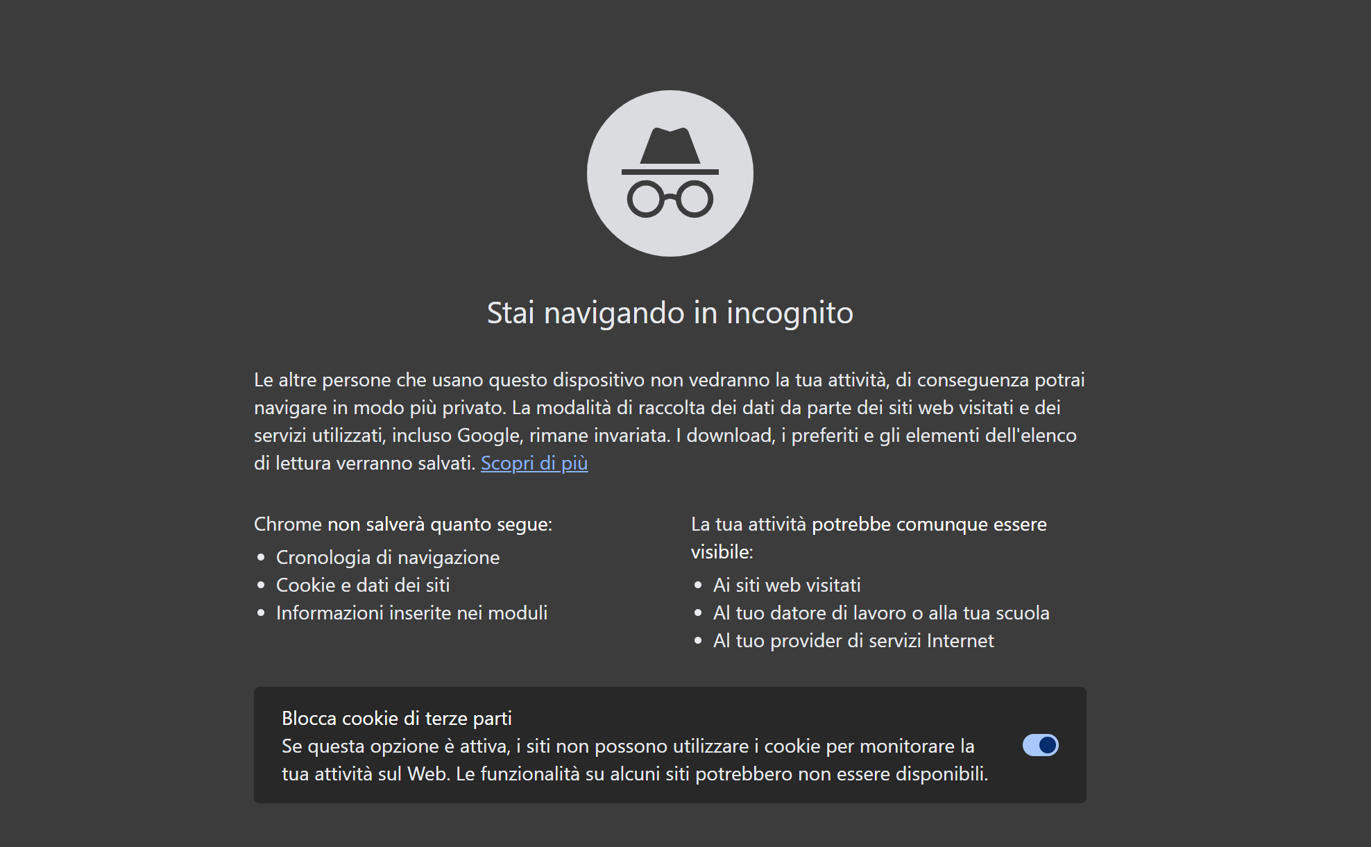 - Prediligere la navigazione in incognito o privata: questa modalità impedisce la memorizzazione locale di cronologia, cookie e credenziali. Tuttavia, non blocca i tracker presenti sulle pagine web, né impedisce al provider o ai server di destinazione di vedere l’attività online. È utile, ma non sufficiente;