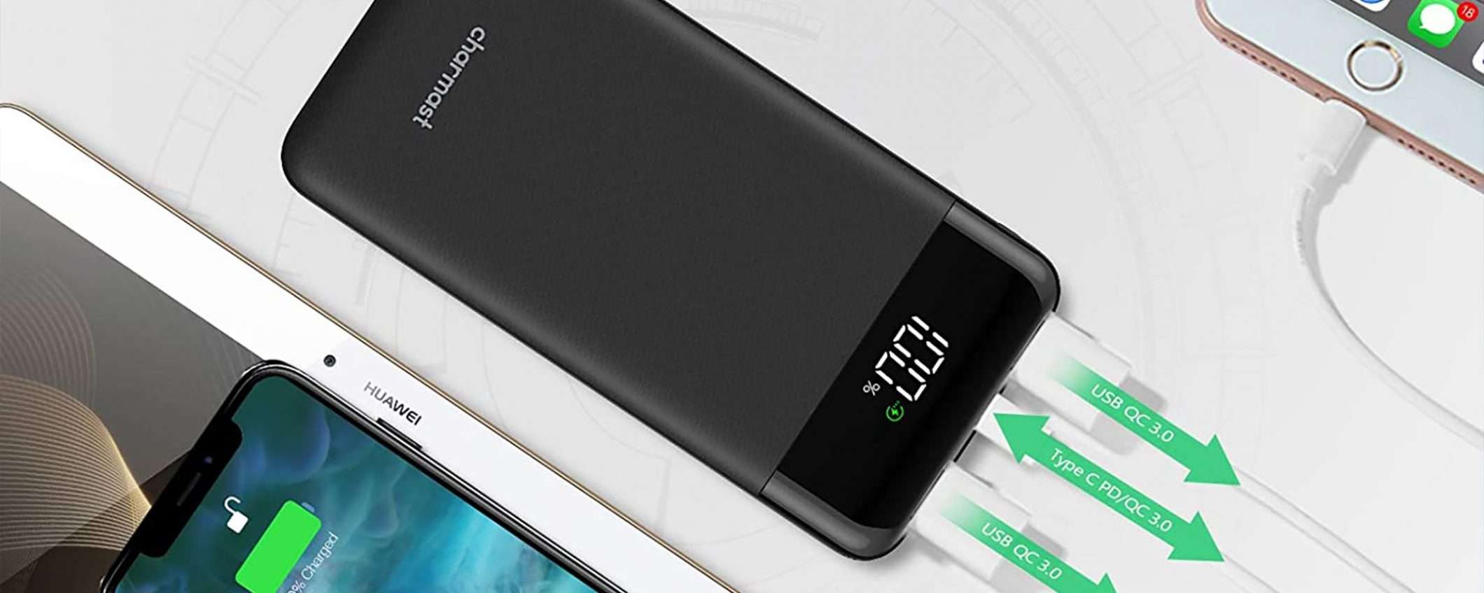 Il primo è quello del marchio Charmast da 10.400 mAh, un buon compromesso tra economicità e design compatto. Supporta la tecnologia Quick Charge 3.0 per la ricarica rapida ed è dotato di porte USB di tipo A e di tipo C. Non manca nemmeno un indicatore LED per conoscere il livello della carica rimanente. Costa solo 16,99 euro invece di 22,99 euro grazie all’offerta lampo.