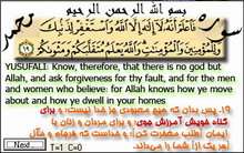 “Yusufali: Sappi, dunque, che non c’è altro dio al di fuori di Allah, e chiedi perdono per i tuoi peccati e per quelli di tutti gli uomini e le donne che hanno fede, perché Allah sa come ci comportiamo e come agiamo anche all’interno delle nostre case”.