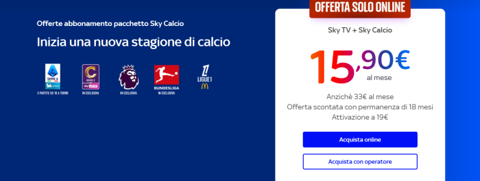 Sky ha presentato una promozione esclusiva online che abbina Sky TV e Sky Calcio a un prezzo speciale: 15,90€ al mese per 18 mesi, invece dei 33€ di listino, con un costo di attivazione una tantum di 19€.
