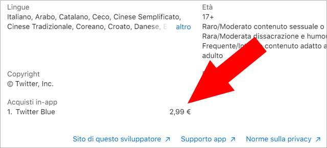L’arrivo di Twitter Blue è ormai cosa certa, nonostante ancora non ci sia un annuncio ufficiale. A confermarlo un riferimento diretto ed esplicito alla formula di abbonamento scovato all’interno della scheda dell’applicazione iOS su App Store, come mostra lo screenshot allegato più avanti nell’articolo.