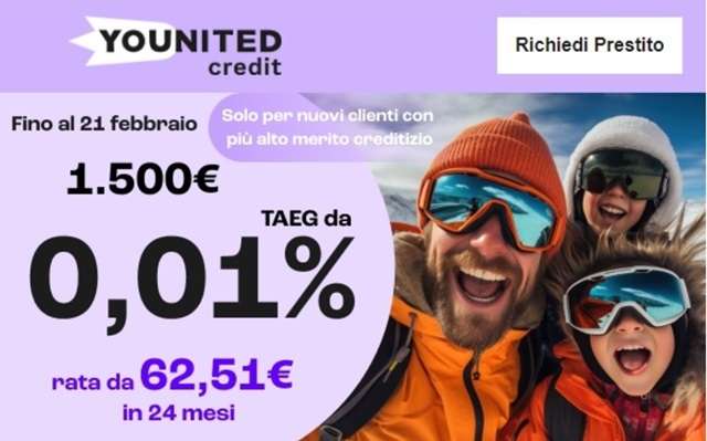 A questo proposito, segnaliamo che alla mezzanotte di oggi scade la promozione di Younited Credit grazie alla quale i nuovi clienti con più alto merito creditizio possono ottenere un prestito di 1.500 euro con un TAEG a partire dallo 0,01%, restituibile con rate mensili da 62,51 euro in 24 mesi. Calcolatrice alla mano, significa restituire la somma ricevuta in prestito aggiungendo 20 centesimi di interessi.