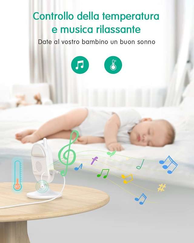 Una delle peculiarità del sistema però appartiene proprio all’altoparlante integrato nella telecamera. Dal monitor è possibile attivare 8 diverse ninne nanne che agevolano il sonno del bambino lasciandoti godere i tuoi momenti in completo relax. Non manca, poi, una modalità VOX che attiva automaticamente il modulo display non appena viene rilevato un suono anomalo dalla stanza del bambino. Tuttavia, il modulo dispone di un sistema di risparmio energetico che ti consente di massimizzare l’autonomia. Completa la dotazione la modalità ad infrarossi capace di offrire un’immagine nitida anche al buio completo. In questo modo potrai tenere d’occhio il bambino a qualsiasi ora del giorno e della notte, senza doverti alzare dal letto.