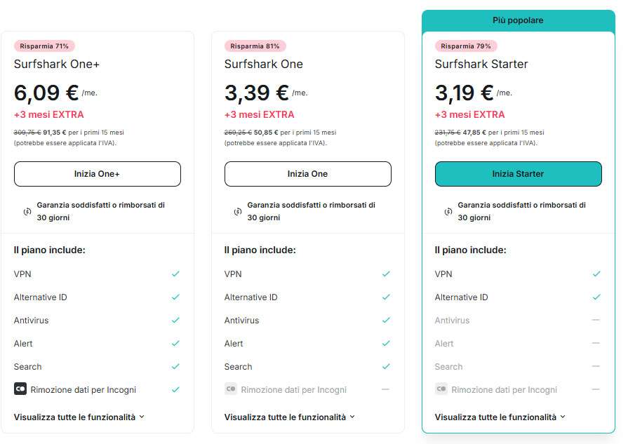 Ora puoi abbonarti a Surfshark Starter al prezzo promozionale di soli 3,19 euro al mese, grazie al 79% di sconto. In più, riceverai anche 3 mesi extra aggiuntivi. Proteggere la propria identità, evitare fughe di dati e accedere al web in totale anonimato è finalmente alla portata di tutti: abbonati ora per risparmiare e tutelarti fin da subito.