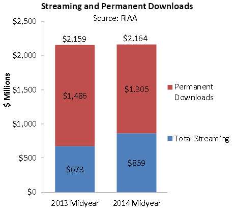 Il mercato statunitense dei download ha subito una contrazione del 12 per cento , assicurando all’industria entrate per 1,3 miliardi di dollari. A calare in maniera più significativa sono i download degli album completi: a fronte di 53,3 milioni di dischi digitali venduti, per un fatturato pari a 544 milioni di dollari, si è registrata una decrescita del 14 per cento rispetto alla prima metà del 2013. La vendita dei singoli brani (644 milioni di brani venduti), invece è in discesa del 9 per cento, a rappresentare un valore di 753 milioni di dollari.