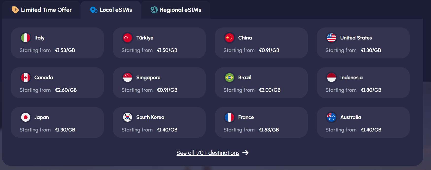 - oltre 170 Paesi tra cui scegliere l’eSIM desiderata