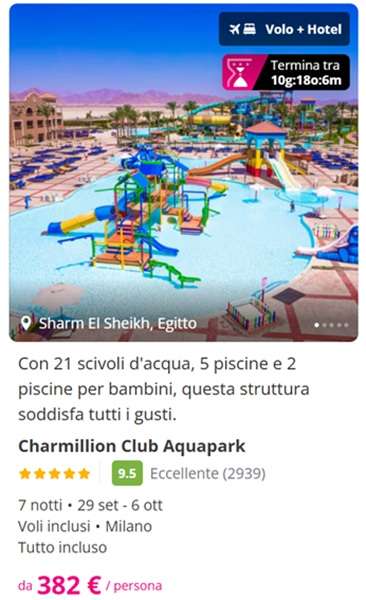 - Sharm El Sheikh, Egitto, da 382 euro a persona per 7 notti, dal 29 settembre al 6 ottobre, presso il Charmillion Club Acquapark (formula all inclusive)