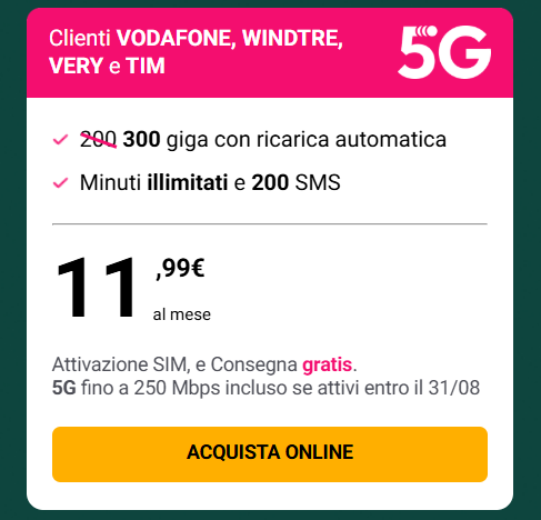 Se stai per partire, questa promo è la soluzione ideale per restare sempre connesso, anche sotto l’ombrellone o in viaggio. Con 300 giga al mese, puoi guardare film e serie in streaming, fare videochiamate con amici e familiari, condividere storie e foto sui social senza dover cercare continuamente un Wi-Fi. La copertura delle reti Vodafone, WindTre, Very e TIM garantisce connessione stabile in tutta Italia e in roaming UE, così puoi navigare anche all’estero senza pensieri. Con soli 11,99€ al mese ti porti a casa una delle soluzioni più complete per chi vive con lo smartphone in mano e non vuole limiti. Attivabile per chi arriva da altri operatori selezionati, questa promo è l’occasione per avere tanti giga e una connessione stabile a un prezzo competitivo. Non restare senza rete proprio sul più bello: passa subito a una delle reti top (Vodafone, WindTre, Very o TIM) e vivi il tuo smartphone senza compromessi.