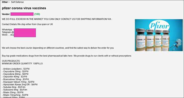 A renderlo noto i ricercatori di Check Point Software. Come si può vedere nello screenshot allegato qui sotto è la cura messa a punto da Pfizer e BioNTech ad essere oggetto degli annunci. Gli autori assicurano di poter spedire da Stati Uniti, Spagna e Regno Unito, offrendo i propri contatti WhatsApp, Telegram e Wickr a chi desidera ottenere maggiori informazioni.