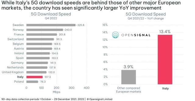 Secondo le rilevazioni effettuate da Opensignal nel quarto trimestre 2022 per un periodo di 90 giorni (1 ottobre – 29 dicembre), l’Italia si colloca al penultimo posto della classifica dei principali paesi in cui il 5G è disponibile. La velocità in download è 107,3 Mbps, ovvero circa il 62% inferiore alla media europea di 173,8 Mbps. Solo la Polonia è alle spalle dell’Italia con 76,3 Mbps. Al primo posto c’è la Svezia con 325,8 Mbps.