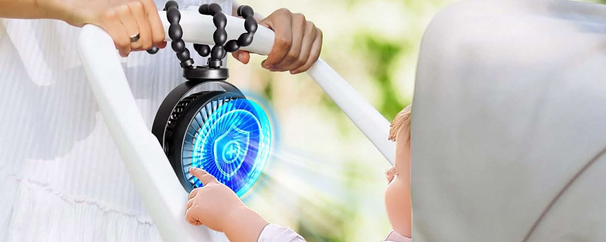 Perfetto anche per il passeggino è una soluzione pratica, sicura e multifunzionale per mantenere freschi i più piccoli durante le giornate estive. Ha in dotazione un robusto treppiede flessibile che permette di fissarlo facilmente ovunque. Al suo interno c’è anche una batteria ricaricabile da 5.200 mAh che garantisce fino a 20 ore di autonomia (si ricarica tramite porta USB-C da power bank, laptop o qualsiasi fonte di alimentazione). La testa regolabile ruota a 360 gradi sia in verticale che in orizzontale, offrendo una brezza direzionabile e silenziosa con tre diverse velocità di ventilazione, per adattarsi a ogni esigenza. È progettato con un’attenzione particolare alla sicurezza, come dimostra la presenza di una griglia anteriore a maglia fitta per evitare qualsiasi contatto con le pale. Scopri di più nella descrizione completa.