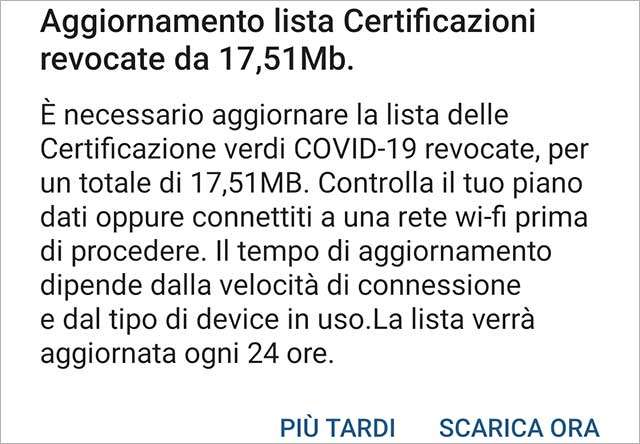 È necessario aggiornare la lista delle certificazioni verdi COVID-19 revocate, per un totale di **,** MB. Controlla il tuo piano dati oppure connettiti a una rete WiFi prima di procedere. Il tempo di aggiornamento dipende dalla velocità di connessione e dal tipo di device in uso. La lista verrà aggiornata ogni 24 ore.