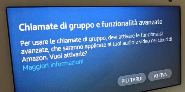 Attraverso il medesimo menu “Contatti” è possibile creare gruppi, ai quali poi indirizzare chiamate avendo sullo schermo più persone al tempo stesso. In questo caso la chiamata avverrà tramite l’istruzione “Alexa, chiama il gruppo Amici” (dove “Amici” è il nome attribuito al gruppo). Al momento la gestione sullo schermo delle varie inquadrature non sembra essere particolarmente raffinata, ma il futuro sembra segnato: prossimamente nuove skill potranno arricchire i video di nuovi filtri e nuove funzionalità, trasformando questa funzione in qualcosa di ben più avanzato.