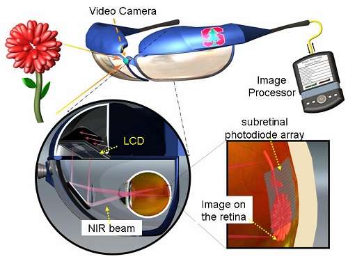 Il design ideato dai ricercatori dell’università californiana è il combinato di un piccolo chip “wireless” installato sulla retina e un paio di occhiali dotato di un micro-sistema di proiezione agli infrarossi: la luce infrarossa viene raccolta dagli occhiali e “proiettata” verso il chip presente sul fondo della retina, dove i recettori sensibili a quel particolare spettro luminoso potranno convertire gli infrarossi in elettricità da trasferire al nervo ottico sottostante.