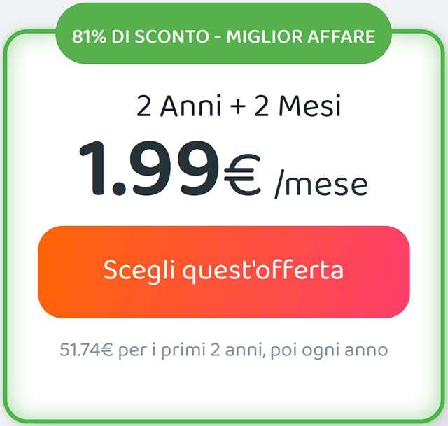Fanno parte del pacchetto anche il monitoraggio delle violazioni email e il supporto clienti 24/7 a cui rivolgersi via email o chat per ottenere assistenza in caso di necessità. L’offerta di oggi con lo sconto dell’81% e 2 mesi gratis propone l’abbonamento biennale alla VPN al prezzo mensile di soli 1,99 euro. Non sappiamo fino a quando rimarrà online.