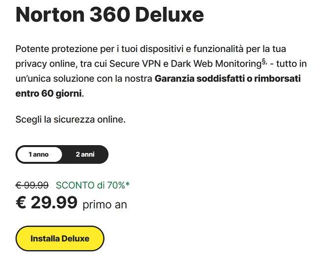 Approfitta dunque degli ultimi giorni del 70% di sconto per attivare Norton 360 Deluxe con VPN e antivirus insieme ad appena 2,5 euro al mese per 1 anno.