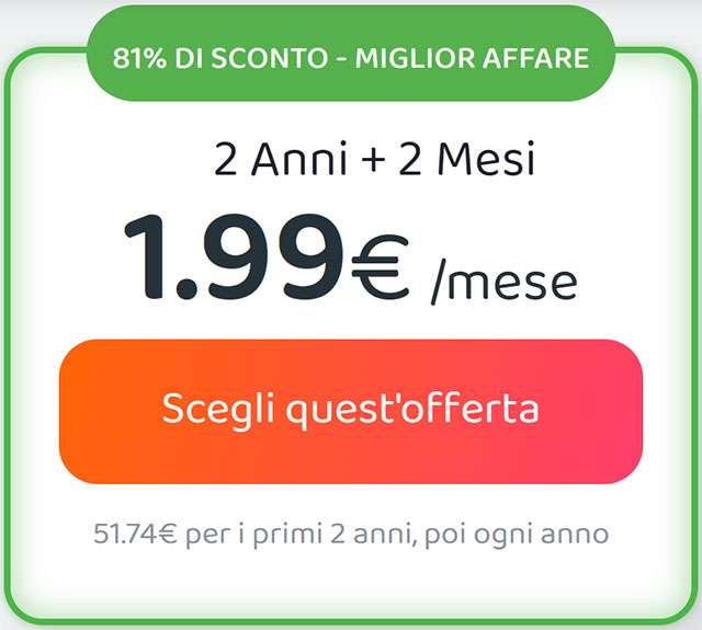 Grazie all’offerta in corso puoi attivare l’abbonamento biennale al prezzo mensile di soli 1,99 euro, una spesa davvero irrisoria, ottenendo in più 2 mesi gratis di accesso completo. La promozione rimarrà valida ancora solo per poche ore.