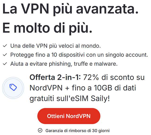 A conti fatti, non si tratta solo di un’offerta 2-in-1. L’unione tra la Virtual Private Network globale di NordVPN e la eSIM di Saily può essere descritta come un passaporto digitale utile per muoversi in tutto il mondo, in totale libertà e senza preoccupazioni legate alla sicurezza dei dati. Non lasciarti sfuggire l’occasione e attivala subito. Se non sarai soddisfatto, potrai richiedere un rimborso della spesa entro 30 giorni dalla sottoscrizione.