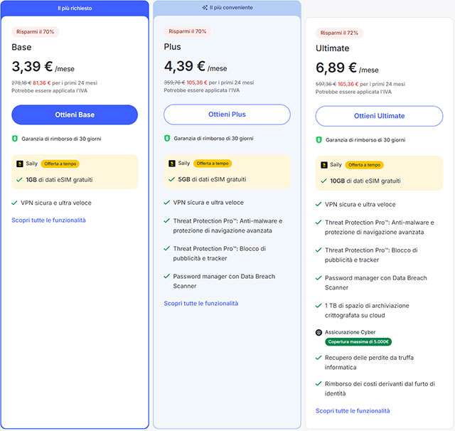 A partire da soli 3,39 euro al mese, il piano Base di NordVPN offre già una protezione completa, ma chi desidera un livello di sicurezza ancora più avanzato può scegliere i pacchetti Plus oppure Ultimate, che includono strumenti aggiuntivi come la protezione anti-malware, la gestione delle password, l’archiviazione crittografata sul cloud e l’assicurazione contro le frodi online. Si tratta di un’offerta 2-in-1 pensata per chi vuol mettere la privacy al primo posto, anche in vacanza.