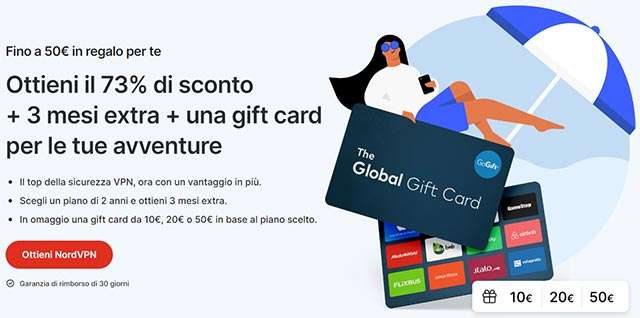 Grazie alla promozione in corso, NordVPN propone uno sconto del 73% e 3 mesi extra scegliendo la formula Ultimate con abbonamento biennale, quella che include tutti gli strumenti della suite (Virtual Private Network globale, password manager, anti-malware, blocco annunci ecc.), oltre all’assicurazione Cyber per il recupero delle perdite da truffa informatica e da frodi per acquisti online, con una copertura di 5.000 euro. Per saperne di più rimandiamo alla pagina dedicata.