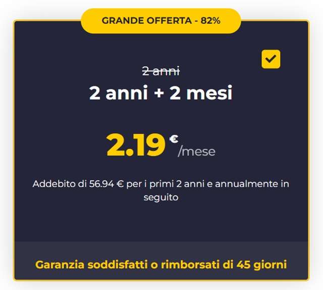 Due anni di CyberGhost VPN sono disponibili al prezzo scontato di 2,19 euro al mese, per effetto dell’82% di sconto. L’offerta è disponibile su questa pagina del sito CyberGhost.