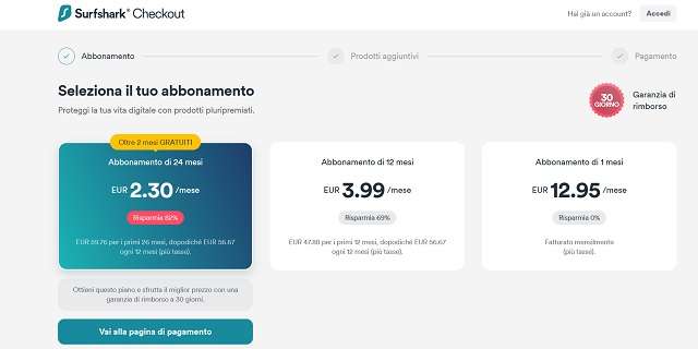 È la miglior offerta in assoluto che Surfshark propone ai nuovi clienti sul suo servizio VPN. E in aggiunta offre anche la garanzia “Soddisfatti o rimborsati” di 30 giorni. Se dunque, per qualsiasi ragione, le prestazioni della VPN non ti dovessero soddisfare, hai tempo fino a 30 giorni dall’acquisto per richiedere il rimborso integrale. Ma al 99,9% non ne avrai bisogno (non scriviamo 100% perché semplicemente non esiste in natura).