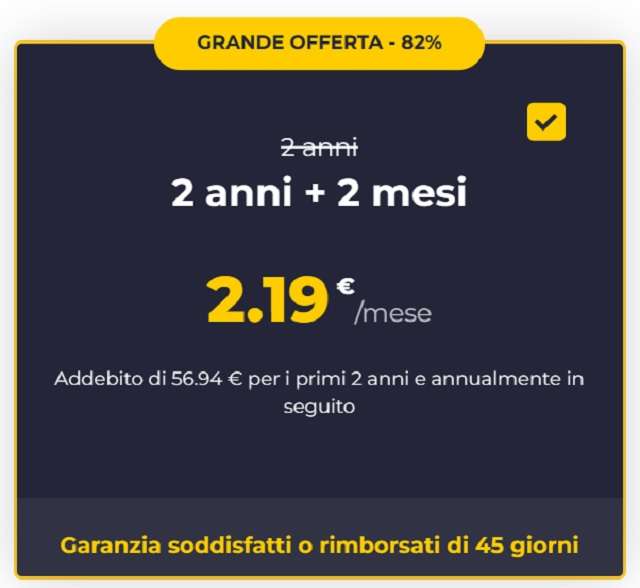 Oggi puoi attivare CyberGhost VPN a soli 2,19 euro al mese per 2 anni, grazie all’82 per cento di sconto applicato sul prezzo di listino. In più benefici di 2 mesi extra in regalo e di una garanzia di rimborso pari a 45 giorni.