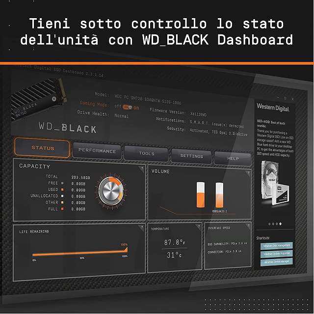 Va ammesso, tuttavia, che si tratta di una soluzione pensata in particolare per i videogiocatori, così come tutta la gamma WD_Black. L’applicazione dedicata alla gestione del disco ne è una dimostrazione. Supporta, infatti, WD_Black Dashboard, uno strumento che consente di monitorare in tempo reale lo stato del disco, l’utilizzo, le condizioni ed ottimizzarlo rapidamente per l’esecuzione dei giochi. Da qui è anche possibile clonare il vecchio hard disk per il passaggio su SSD e tenere sotto controllo le temperature. In conclusione, la proposta di Western Digital punta tutto sulla velocità e l’efficienza, una delle migliori scelte attualmente sul mercato per rapporto qualità/prezzo. Da non trascurare è infatti la garanzia di ben 5 anni offerta dall’azienda.