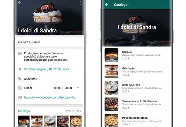Una sorta di vetrina virtuale in cui mostrare ciò che si fa e cosa si offre, con la possibilità per chi è interessato di cercare in modo semplice gli articoli o i servizi da acquistare, senza essere indirizzati esternamente al sito Web. Questo solleva commercianti e professionisti dall’obbligo di inviare ogni volta le immagini dei prodotti, ripetendo a ogni interazione le stesse informazioni. Piuttosto esplicativo l’esempio fornito dallo screenshot di seguito con il catalogo de “I dolci di Sandra” che propone una panoramica su tutte le torte preparate.