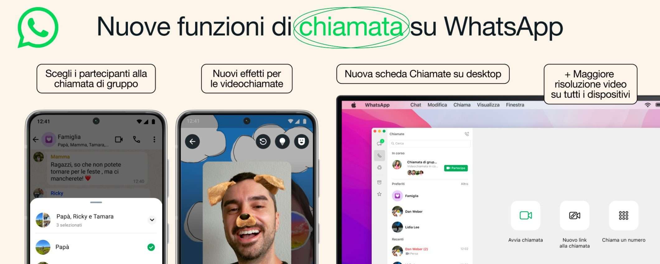 L’ultimo aggiornamento di WhatsApp. È disponibile per tutti gli utenti Android, iOS e desktop, e porta nuovi effetti per le videochiamate, la possibilità di selezionare i partecipanti alle chiamate di gruppo e molto altro.