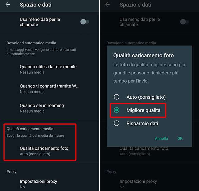 ). Un tap e si apre il popup con le tre alternative proposte ovvero “Auto (consigliato)”, “Migliore qualità” e “Risparmio dati”, quest’ultima pensata per chi non è connesso a una rete Wi-Fi e deve fare i conti con i limiti imposti dal proprio operatore in termini di traffico dati consumato o con una connessione dalle prestazioni non particolarmente elevate. Quella da scegliere per recapitare immagini in alta risoluzione è ovviamente la seconda, mostrata nello screenshot qui sotto.