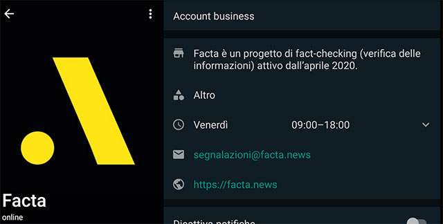 La neonata realtà italiana collabora con Facebook per offrire nel nostro paese attraverso WhatsApp un servizio di fact checking: è sufficiente scrivere al numero +393456022504 (l’account è di tipo Business) con dettagli sul contenuto. Dopo l’invio del primo messaggio verrà chiesto di acconsentire al trattamento dei dati secondo le modalità specificate nella policy sulla privacy. In alternativa è disponibile l’indirizzo email segnalazioni [at] facta .news.
