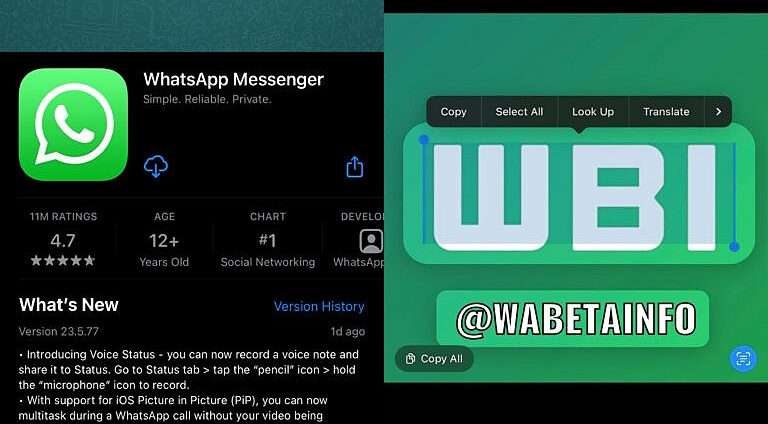 Come riportato dagli attenti colleghi di WABetaInfo, infatti, la nuova versione 23.5.77 di WhatsApp per dispositivi iOS – a patto che si tratti di iOS 16 e versioni successive – consente di selezionare il testo incluso in un’immagine o in un video per copiarlo come testo.