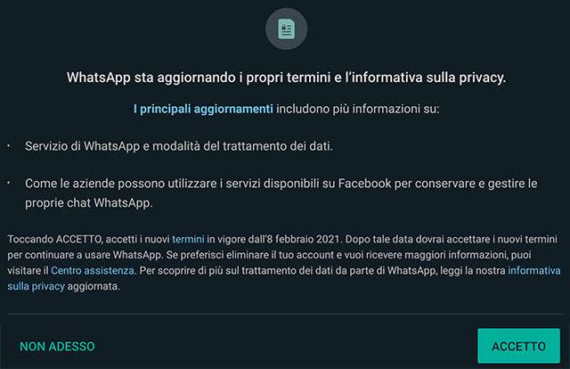 C’è stata molta disinformazione e confusione riguardo al nostro recente aggiornamento e vogliamo aiutare tutti a comprendere come WhatsApp protegge la privacy e la sicurezza delle persone. In futuro forniremo aggiornamenti alle persone nella scheda Stato, in modo che le persone ascoltino direttamente WhatsApp. Il nostro primo aggiornamento ribadisce che WhatsApp non può vedere i tuoi messaggi personali, e nemmeno Facebook, perché sono protetti dalla crittografia end-to-end.