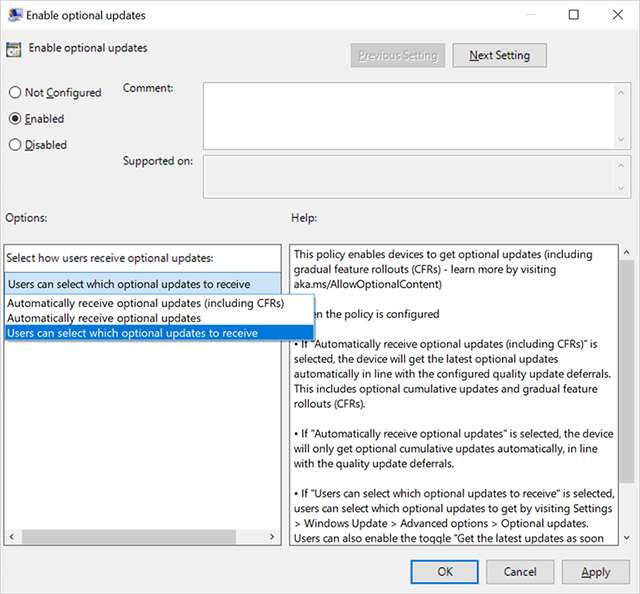 Nel dettaglio, la novità consiste in una modifica alla group policy “Enable optional updates”. Interessa anche gli update distribuiti attraverso l’approccio noto come CFR (Controlled Feature Rollout). Sono state messe a disposizione diverse opzioni, come visibile nello screenshot qui sotto, una delle quali attribuisce all’utente finale la facoltà di scegliere quali pacchetti scaricare e quali invece evitare.