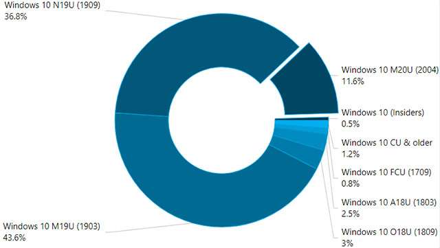 Di seguito il grafico che mostra la situazione nel suo complesso: la 1903 detiene il 43,6% della quota, la 1909 il 36,8%, la 2004 disponibile da un paio di mesi l’11,6%, la 1809 il 3%, la 1803 il 2,5% e la 1709 lo 0,8%. I dati sono aggiornati al 30 luglio e fanno leva sull’analisi di oltre 5.000 applicazioni distribuite attraverso lo store ufficiale di Microsoft.