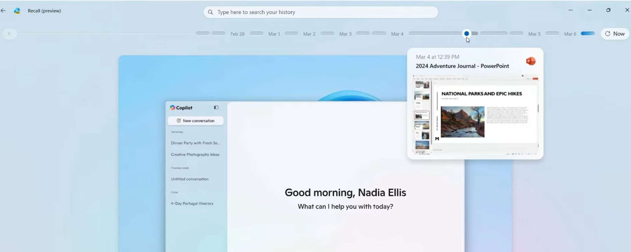 Il rollout delle tre funzionalità AI avverrà gradualmente nel corso dei prossimi mesi. Recall e Click to Do non saranno inizialmente disponibili in Europa, mentre la versione potenziata di Windows Search non supporta ancora l’italiano. Recall permette di trovare informazioni sulle attività precedenti attraverso una timeline o la ricerca testule. È necessario attivare la funzionalità (opt-in) per consentire la cattura degli snapshot. Nonostante i miglioramenti introdotti (ribaditi in un nuovo post), un ricercatore di sicurezza ha evidenziato alcuni problemi ancora non risolti.