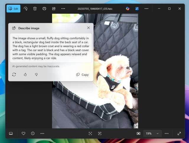 Gli utenti possono già eseguire varie operazioni con le immagini (elencate nel menu contestuale), come l’eliminazione dello sfondo o degli oggetti indesiderati con le app Paint e Foto. La nuova azione Describe Image permette di sfruttare i modelli AI per ottenere la descrizione testuale dell’immagine. L’elaborazione avviene sul dispositivo. Al momento sono supportati solo i Copilot+ PC con processori Snapdragon.