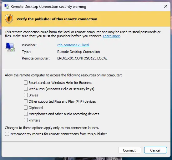 Un secondo avviso di sicurezza viene mostrato per ogni apertura successiva. Se il file RDP non è firmato (fonte sconosciuta), l’avviso è questo: