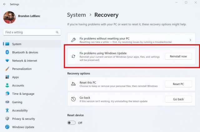 Nella pagina Impostazioni > Sistema > Ripristino è stata aggiunta l’opzione “Fix Problems using Windows Update” che permette di reinstallare l’attuale versione di Windows 11 mantenendo file, impostazioni e app. Il sistema operativo viene scaricato tramite Windows Update. I contenuti riparati verranno chiaramente indicati nella pagina di Windows Update.