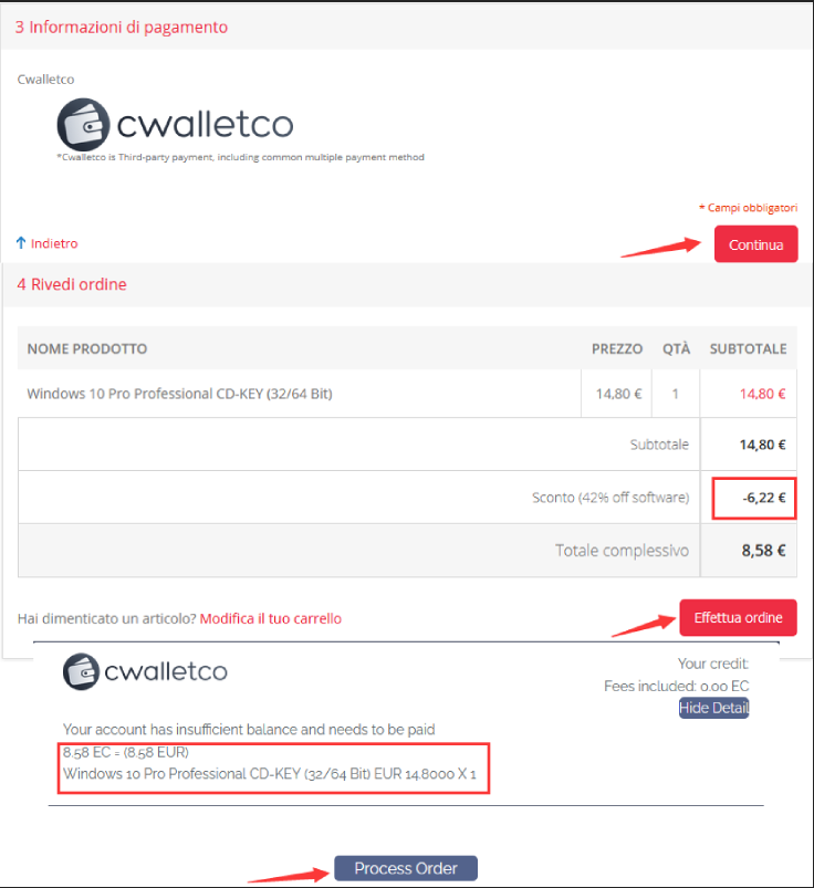 Controlla il carrello e applica per esempio il codice coupon KOLE42: lo sconto sarà subito visibile nel totale, quindi si potrà procedere al checkout.
