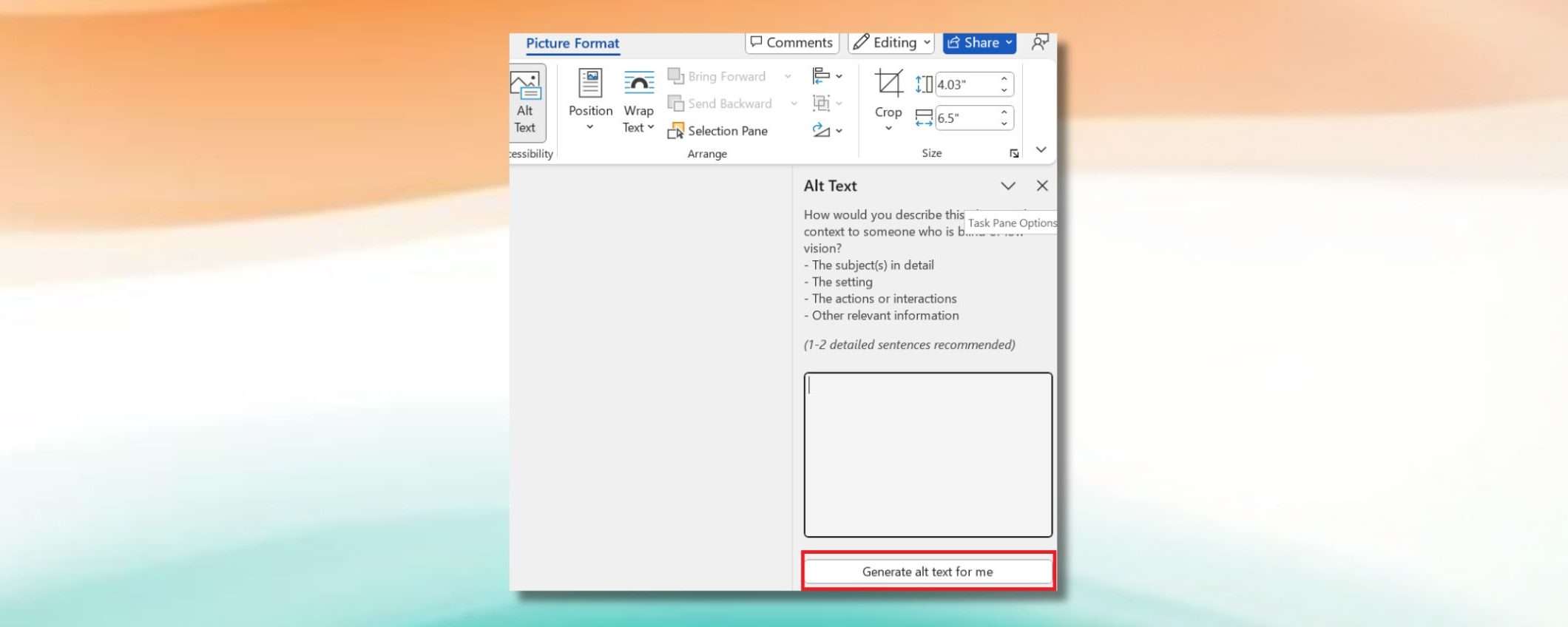 C’è però un cambiamento significativo nel funzionamento. Prima, Azure Vision generava automaticamente il testo alternativo per tutte le immagini inserite. Ora, con l’AI, gli utenti dovranno attivare manualmente la generazione ogni volta che ne hanno bisogno. Basta andare su Formato immagine > Testo alternativo > Genera testo alternativo per me, e l’AI fa il suo lavoro.