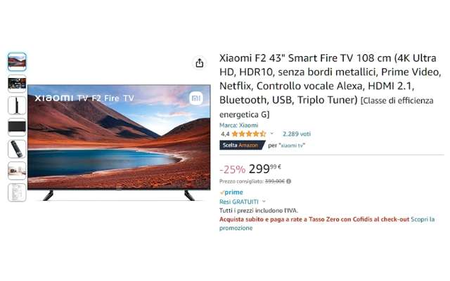 Con disponibilità immediata, se sei cliente Prime, la ricevi a casa tua senza costi aggiuntivi grazie alla consegna gratuita inclusa. Inoltre, puoi anche decidere di pagare in comode rate tasso zero selezionando Cofidis prima del check out. Scopri tutte le potenzialità di questo televisore che include il pluripremiato sistema operativo Fire TV per un accesso perfetto alle tue piattaforme preferite.